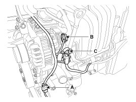 6. Disconnect the A/C compressor switch connector (A), the alternator connector (B) and the cable from the alternator "B" terminal (C).