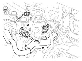 9. Disconnect the FPCV (Fuel pressure control valve) connector (A), the intake CMPS (Camshaft position sensor) connector (B) and the exhaust CMPS (Camshaft position sensor) connector (C).