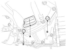 2. Remove the dust cover (A) and unfasten the transaxle mounting bolt (B).