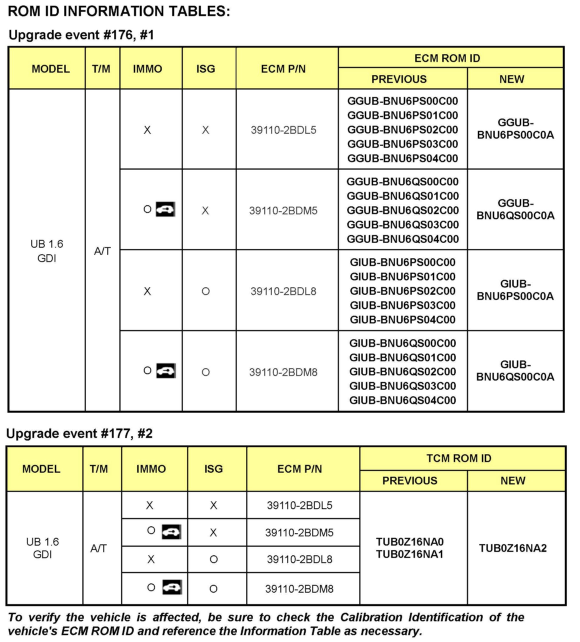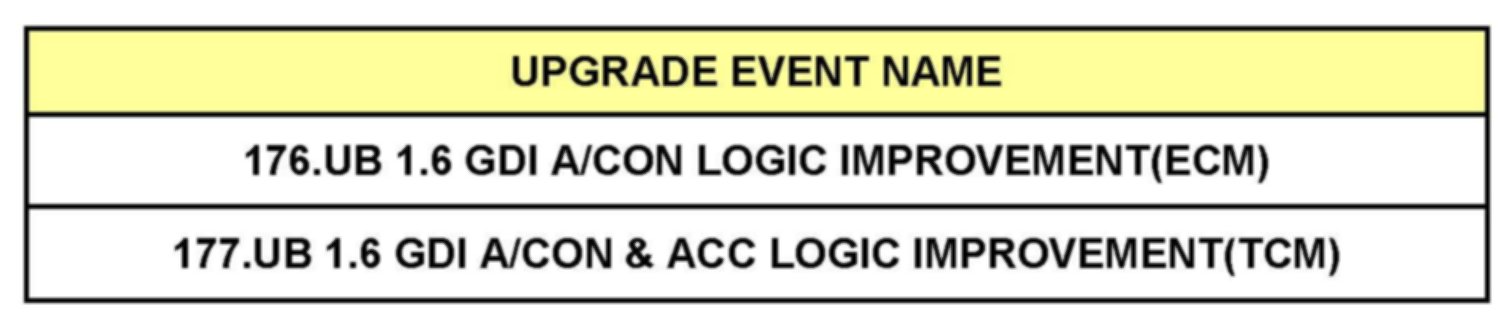 This bulletin provides information about the ECM/TCM software upgrade of some 2012MY Rio (UB) 1.6L GDI vehicles with an automatic transmission produced from Job #1 to October 15, 2011 to improve A/Con (Air Conditioner) performance and ACC (Auto Cruise Control) logic. For confirmation that the latest reflash has been done to a vehicle you are working on, verify ROM ID using the tables in this TSB. To ensure maximum customer satisfaction Kia is requesting the completion of this Service Action on all affected Rio (UB) vehicles.
