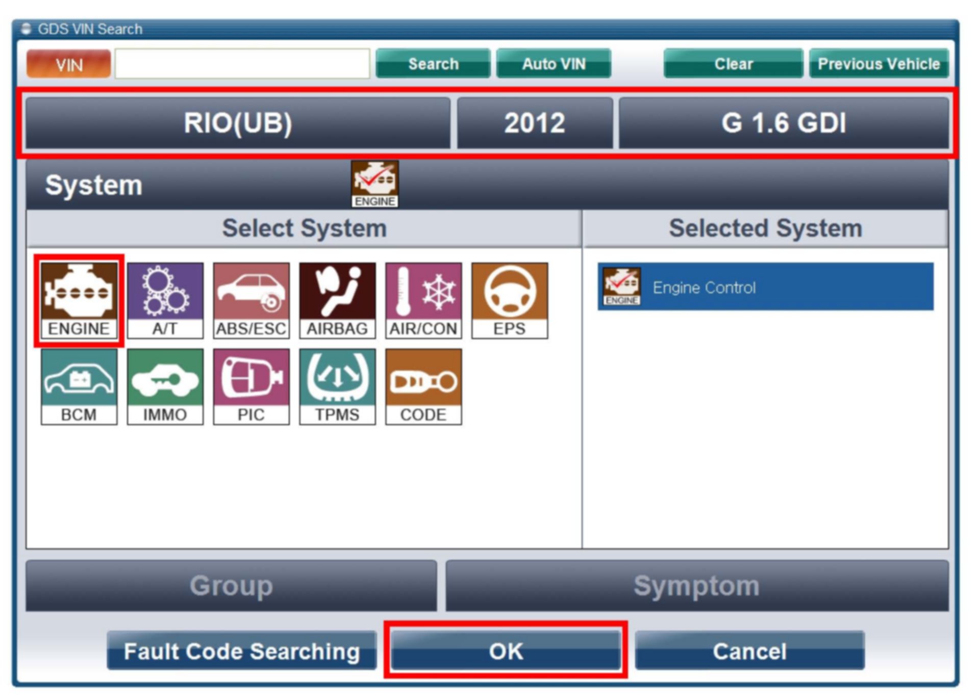 1. With the ignition key ON, turn ON the VCI and GDS tool; access the GDS vehicle identification number (VIN) screen and configure the vehicle using the Auto VIN detect function.