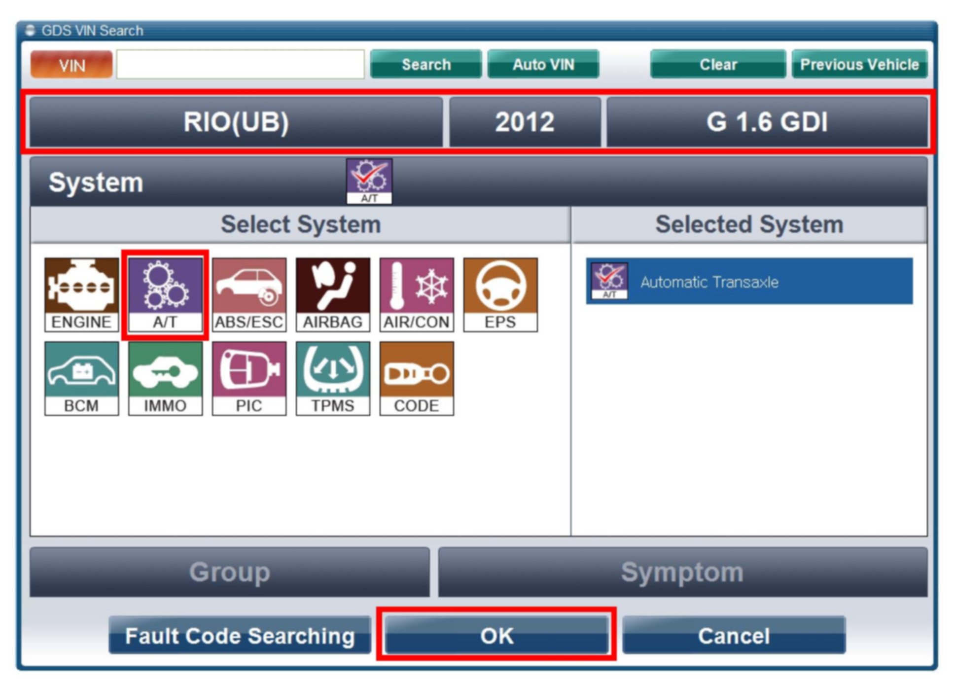 5. With the ignition key ON, turn ON the VCI and GDS tool; access the GDS vehicle identification number (VIN) screen and configure the vehicle using the Auto VIN detect function.