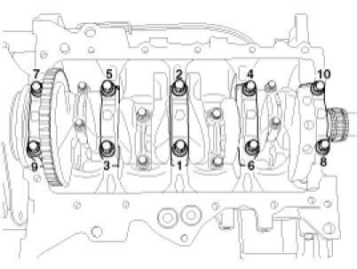 Install and uniformly tighten the 10 bearing cap bolts, in several passes, in the sequence shown.