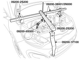 8. Using the engine support fixture (Support SST No.: 09200-2S200, Adapter SST No.: 09200-1P000, 4X000, Beam SST No.: 09200-38001/3N000), hold the engine and transaxle assembly safely.