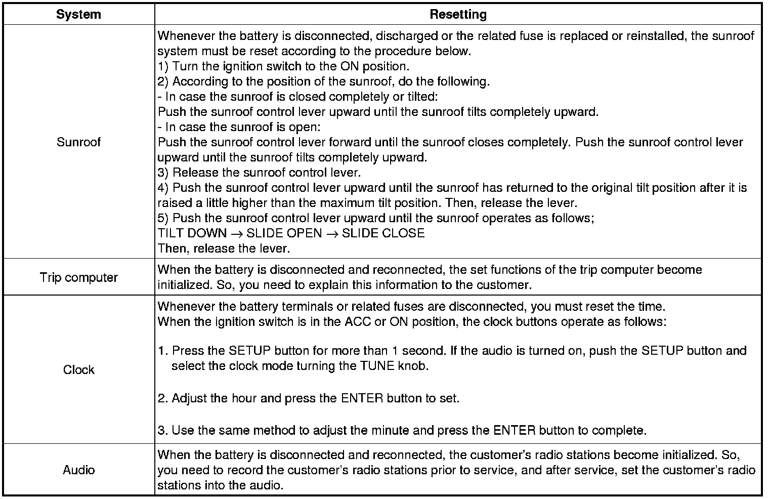 When reconnecting the battery cable after disconnecting, recharging battery after discharged or installing the memory fuse located on the driver's side panel after removing, be sure to reset systems mentioned on the below table.