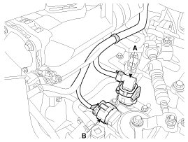 7. Disconnect the hose (B) after removing the automatic transaxle fluid cooler hose clamp (A).