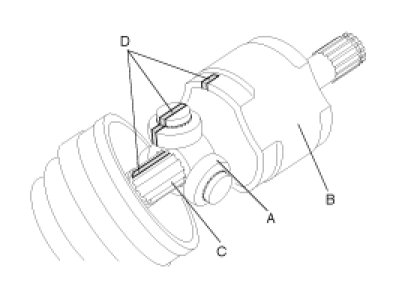 6. Using the alignment marks (D) made during disassembly as a guide, install the spider assembly (A) and snap ring (B) on the driveshaft splines (C).
