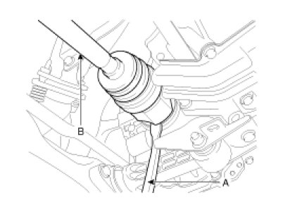 11. Insert a pry bar (A) between the transaxle case and joint case, and separate the drive shaft (B) from the transaxle case.