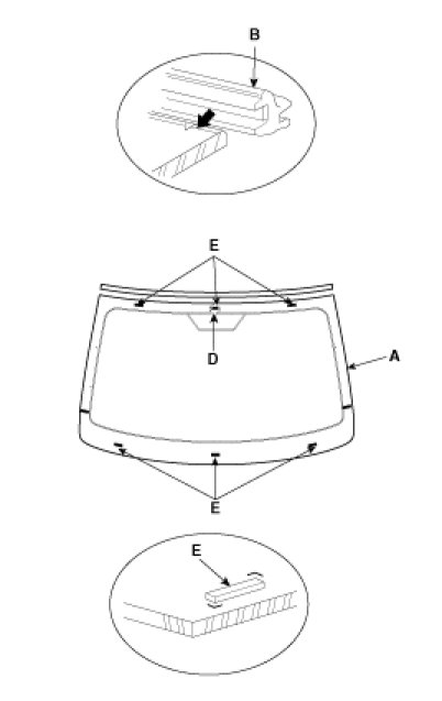 3. Install the windshield (A) upper molding (B) and fasteners (E).