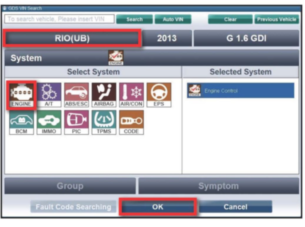 5. With the ignition key ON, turn ON the VCI and GDS tool. Access the GDS vehicle identification number (VIN) screen and configure the vehicle using the VIN Auto Detect function.