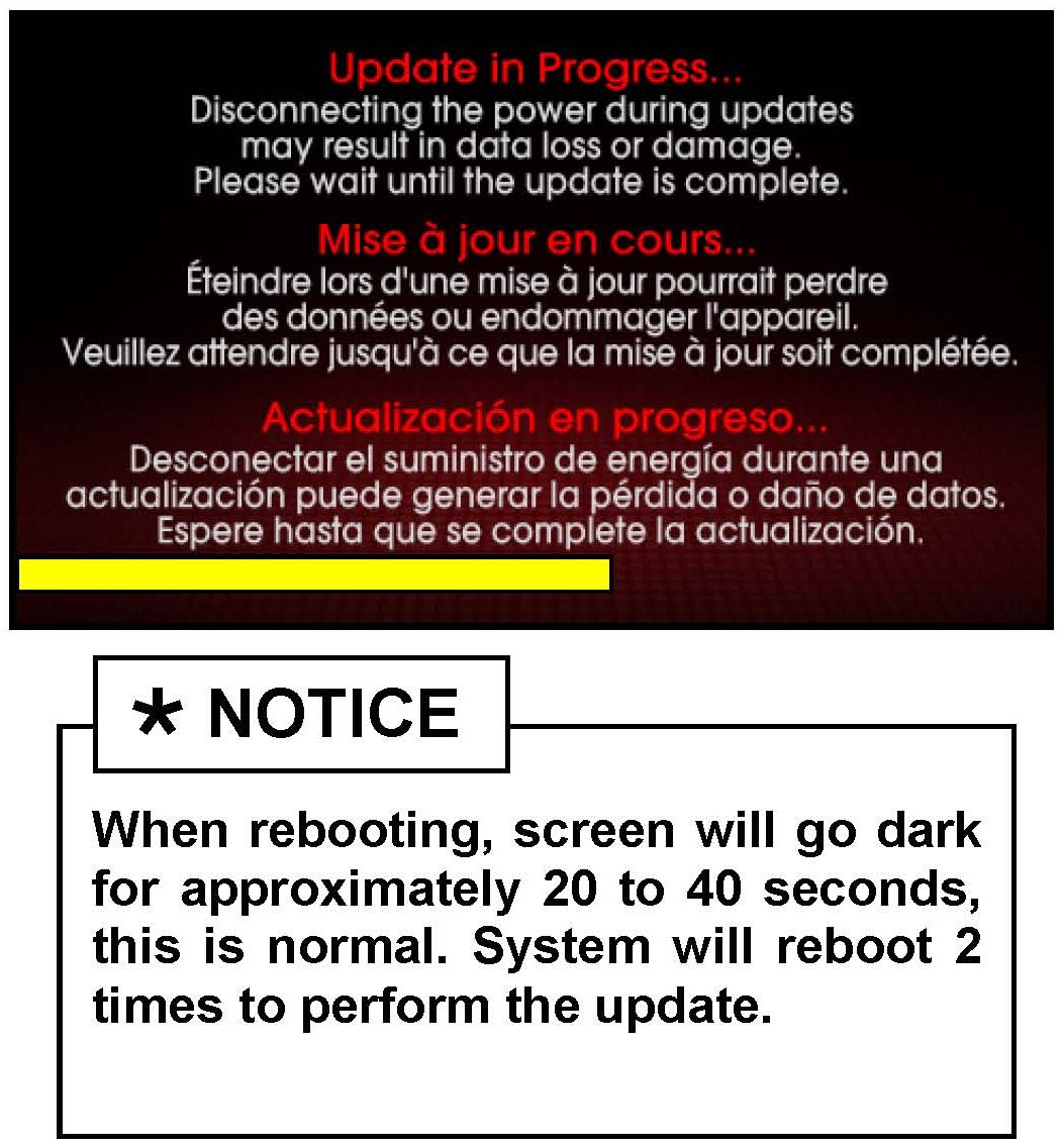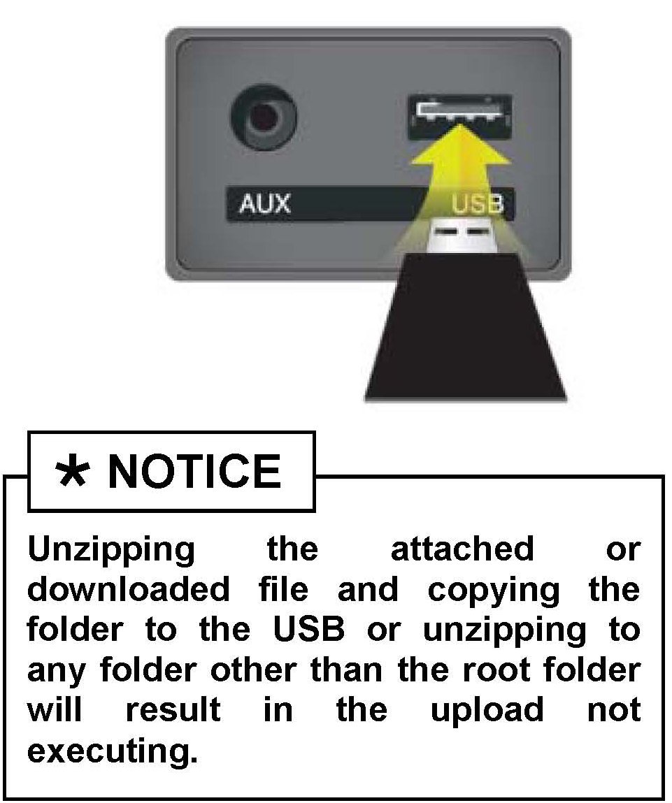 The system will display "Reading Media" on the screen after USB is inserted. This is normal, since the unit is searching for music files. Then the system will display a "No File Available" pop-up after system music search is complete, wait until new screen appears and continue with the upgrade.