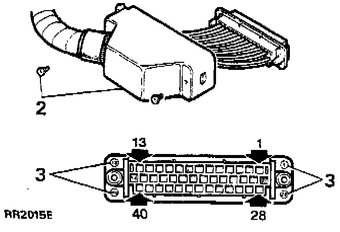 NOTE: There are 4 pin numbers, 1, 13, 28, 40 moulded onto the rear of the plug for pin position identification as shown. For clarity the electrical leads have been omitted.ECU Connector Pin ID:
