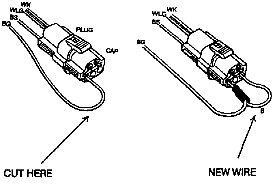 2. Locate the black/green wire (BG) on cap side of socket and cut the wire 2" from the socket Strip 1/2" of insulation from the cut ends.