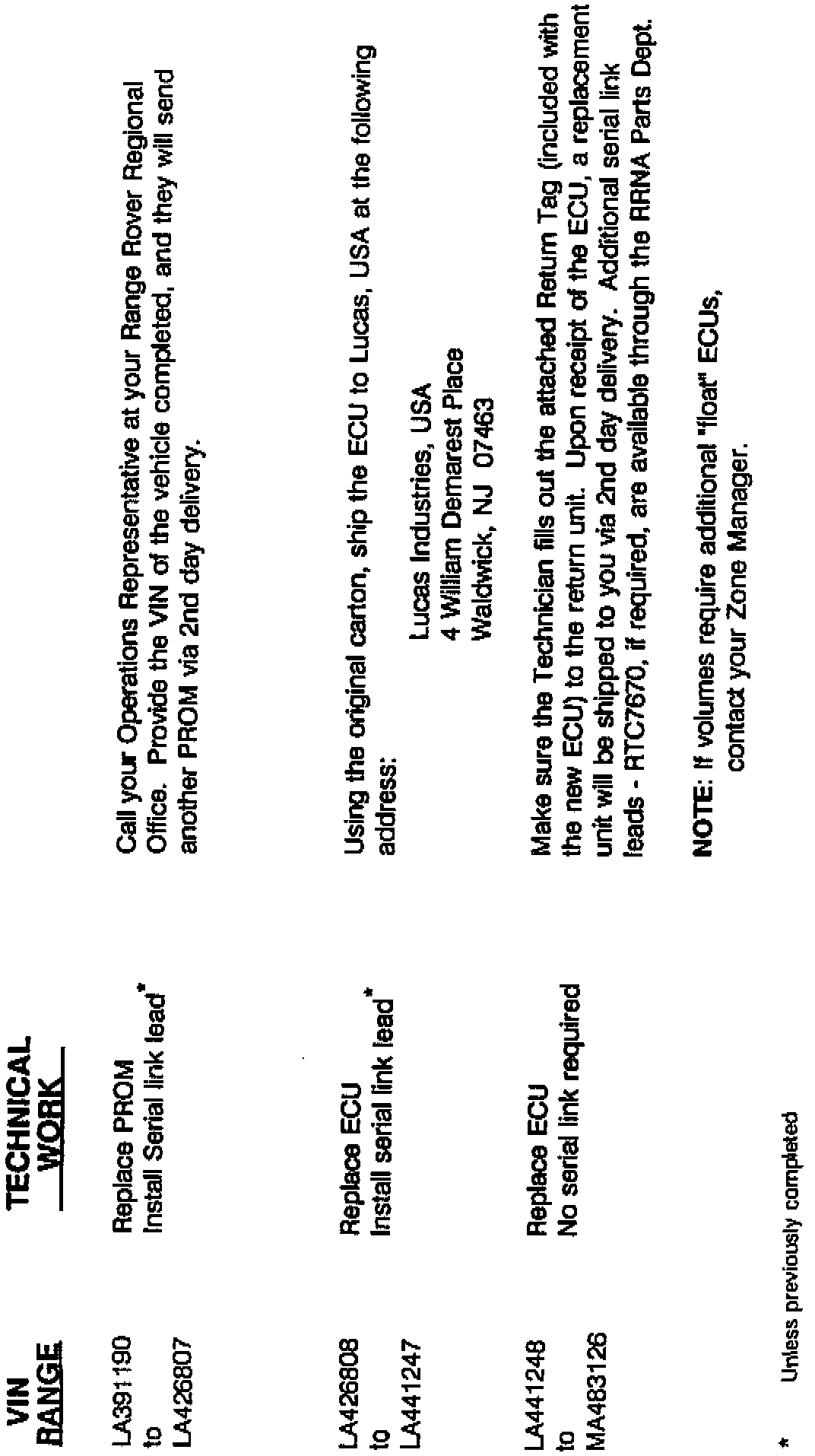 The repair to your vehicle under this recall will involve the checking of the idle speed control system of your Range Rover, with an adjustment if necessary. The repair will also include the updating of the Electronic Control Unit for the fuel injection system. All together, these repairs will provide the best assurance that the "CHECK ENGINE" (Malfunction Indicator Light) will not illuminate inappropriately.