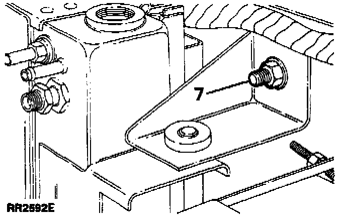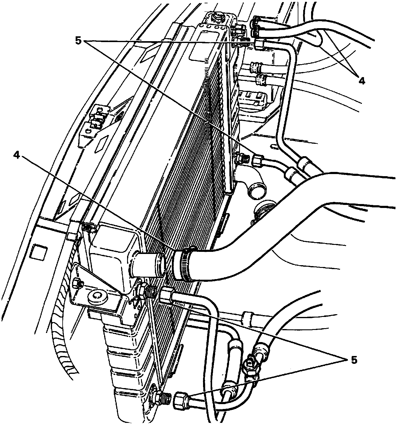 5. Disconnect the four transmission and engine oil cooler connections to the radiator end tanks. Note that oil spillage will occur when connections are loosened. Blank off exposed oil connections.