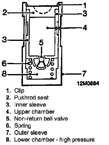 When the cam begins to lift the outer sleeve, the resistance of the valve spring felt through the push rod and seat causes the tappet inner sleeve to move downwards inside the outer sleeve. This downward movement of the inner sleeve closes the ball valve and increases the pressure in the lower, high pressure chamber, sufficiently to ensure that the push rod opens the valve fully.