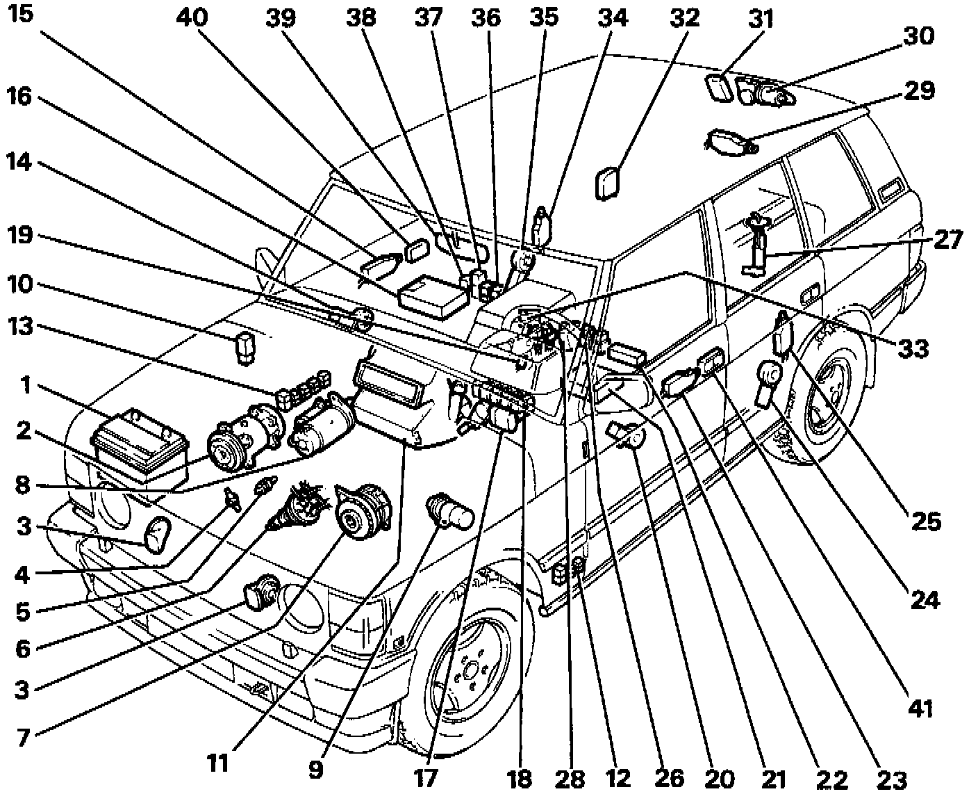 NOTE: Left hand drive vehicle shown. Items 10, 12, 13, 17 and 18 located symmetrically opposite on right hand drive vehicles.