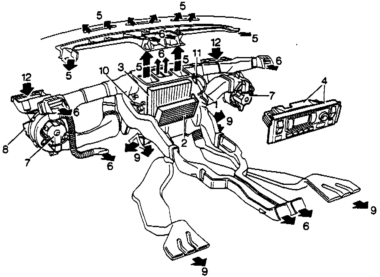 7. Blower motor, fresh air and recirculate face vents housing