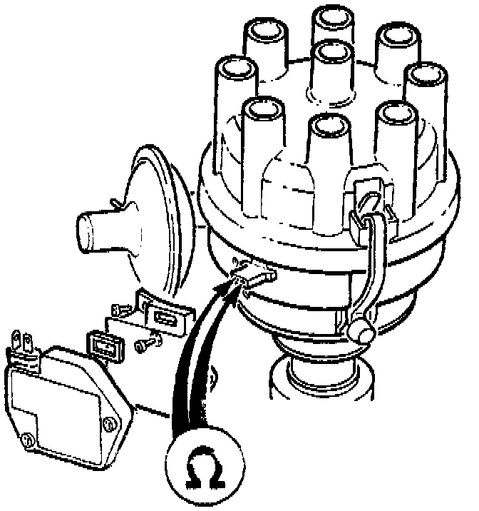 - Connect the ohmmeter leads to the two pick-up terminals in the body of the distributor.