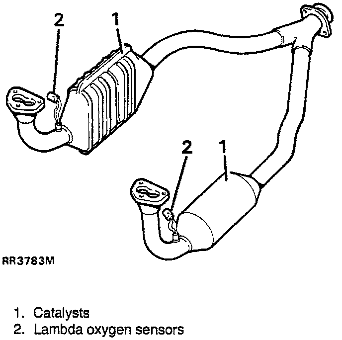 (2) are located forward of the catalysts mounted in each exhaust downpipe.