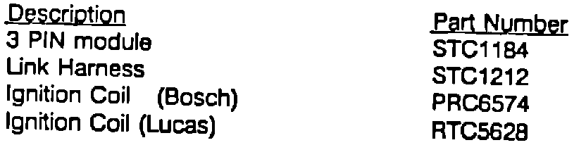 Check HT output of coil. No HT output, or output less than 15KV or, distributor dwell angle is greater than 15 degrees at idle, indicating that the current control circuit has failed, replace both the ignition control module and the coil. Replace the 2 PIN module on the distributor, Part No. RTC5089, with 3 PIN module, Part No. STC1184. The 3 PIN module requires a link harness, Part No. STC1212, to adapt it to a 2 PIN application.