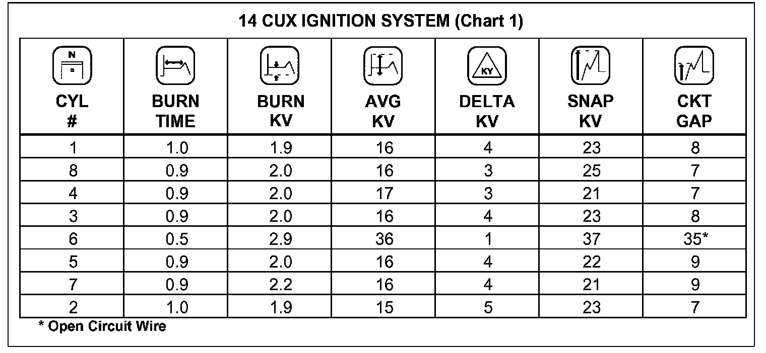 A high average KV, somewhere around 35 KV (see Chart 1), is an indication of an open circuit on that cylinder.
