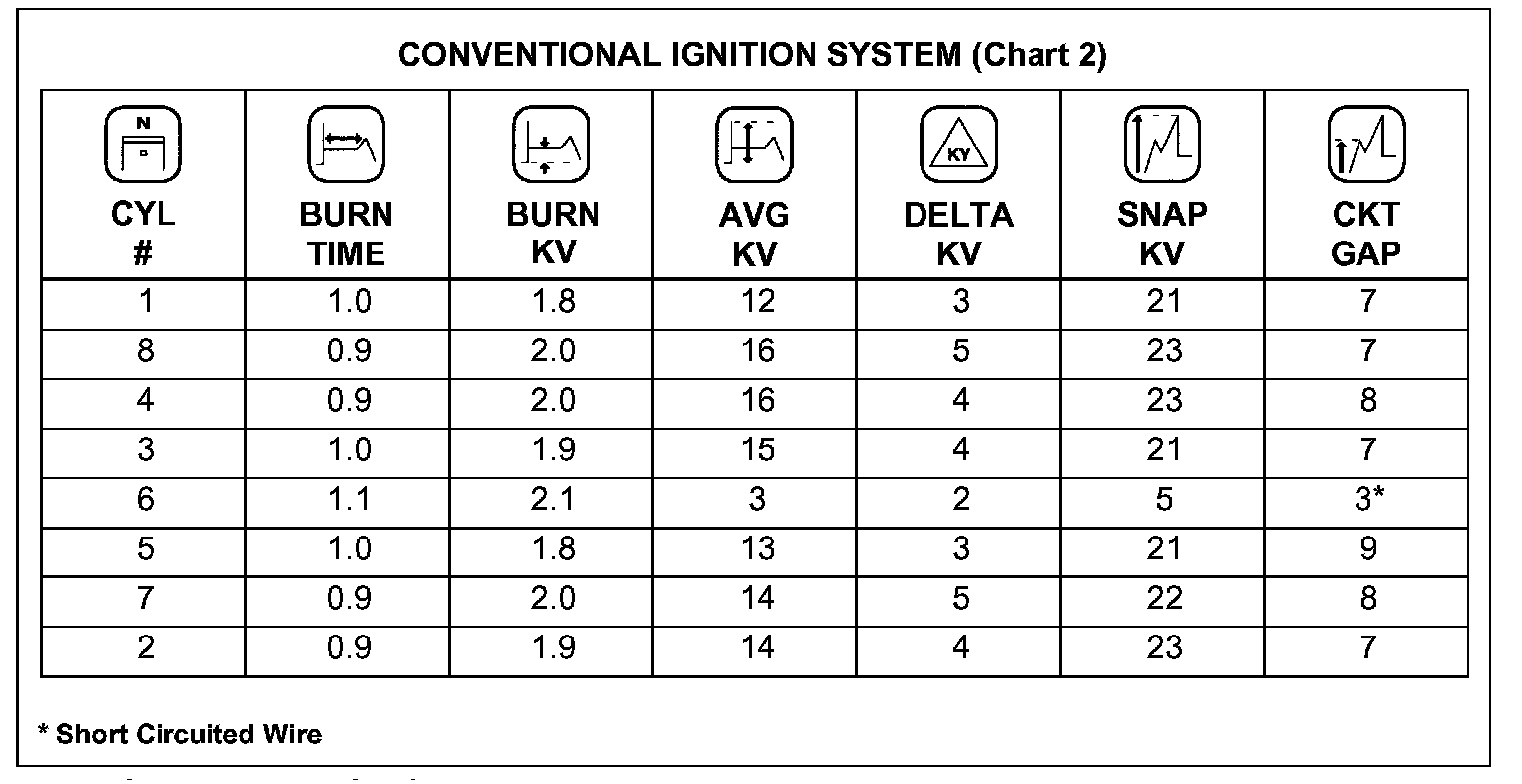 A very low average KV, around 2-3 KV (see Chart 2) indicates a possible short circuit in the plug wire or spark plug. Only the wires that are out of specification or show signs of arcing are to be replaced.