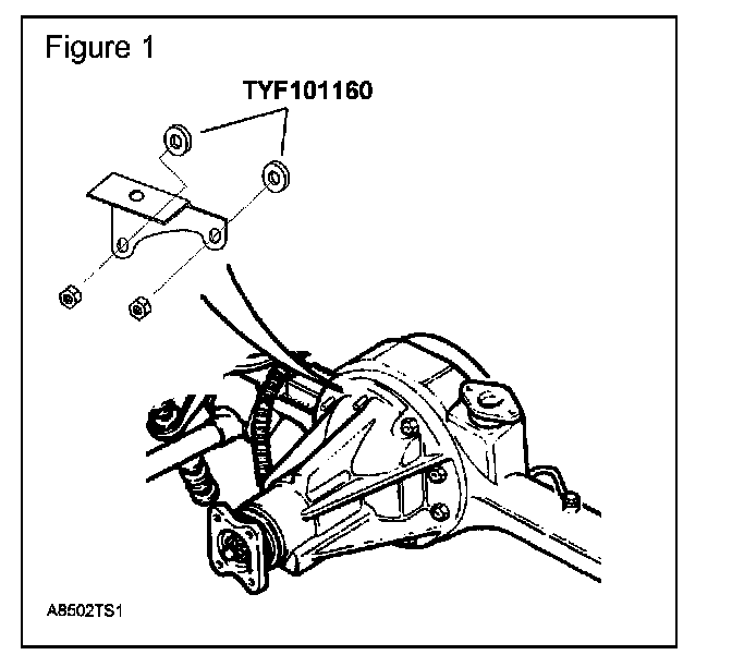 Upon installation of a new design rear differential (FTC5142) on a Discovery Series I or Defender 90 vehicle, before fitting the brake line bracket, install two spacers (TYF101160) between the bracket and differential housing.