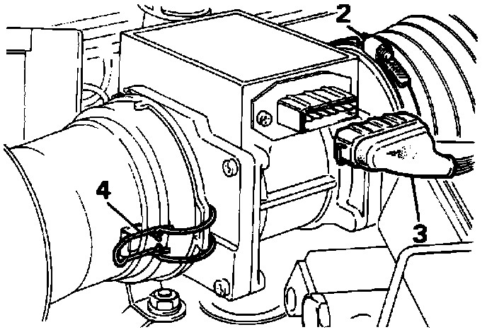 The hot-wire air flow sensor is mounted on a bracket attached to the left hand valance, rigidly connected to the air cleaner and by hose to the plenum chamber inlet neck.
