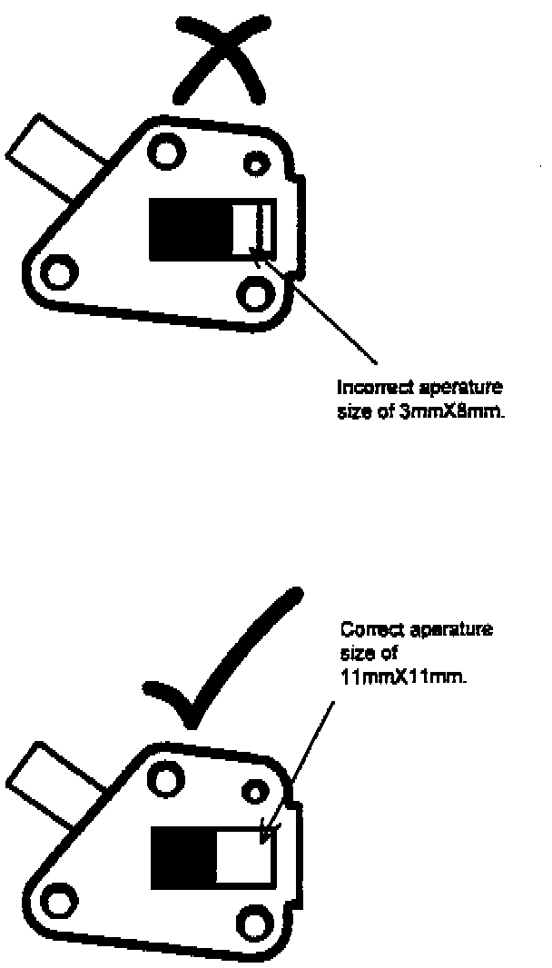 1. The aperture on faulty castings is approximately 0.315 x 0.118 in (8x3 mm) (on normal castings the aperture should be 0.433 x 0.433 in (11x11 mm)).