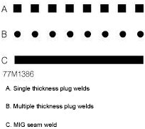 - The replacement welds in the welding diagrams are denoted by the following symbols: