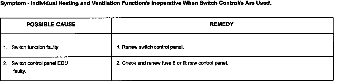 NOTE: Should any fault occur in the heating and ventilation system on vehicles fitted with air conditioning a 'book' and '!' symbol will be displayed on the switch control panel.