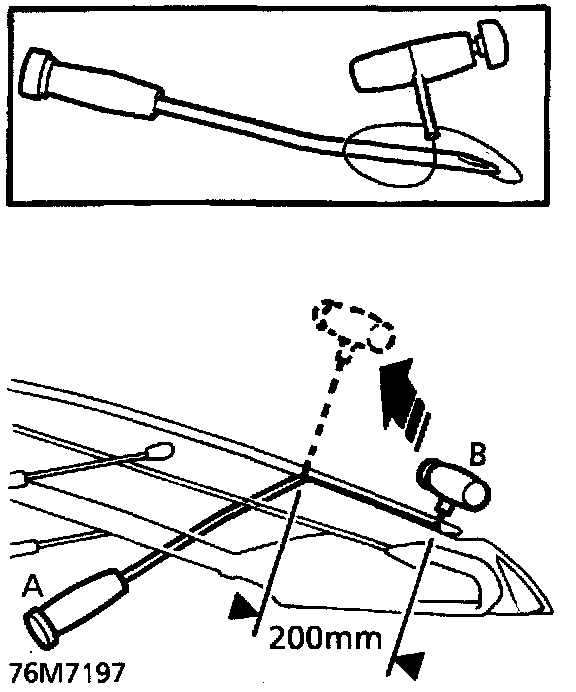 14. With assistance, wedge tube of handle 'A' between glass and body, ahead of the cutting position, and carefully cut the sealer using a continuous pull on handle 'B' from the outside. Cut side and top edges first. Attach suction lifters and restrain glass as last of sealant is cut.
