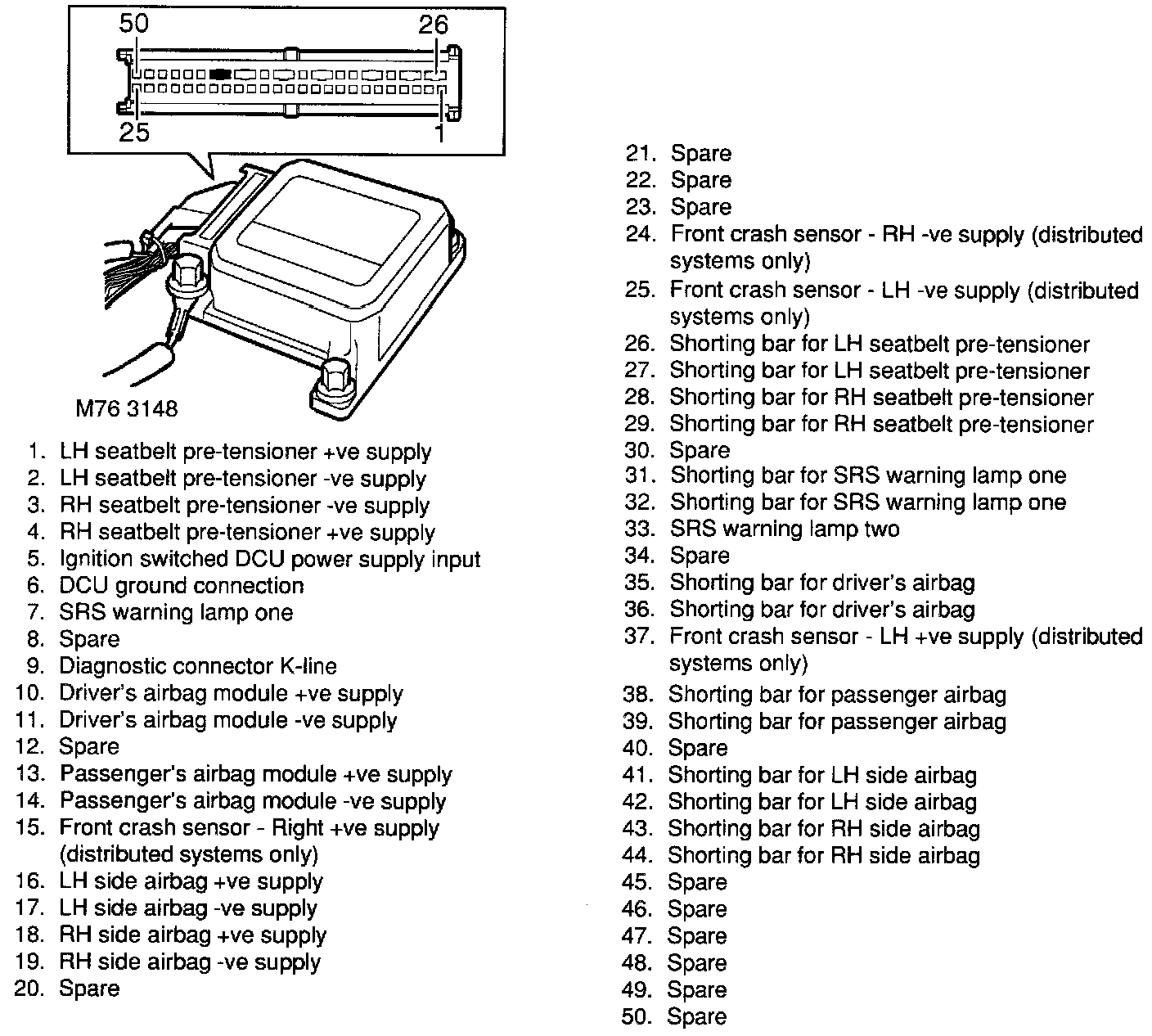 A yellow 50-pin connector provides the SRS DCU connection with the vehicle harness on models from 99MY onwards.