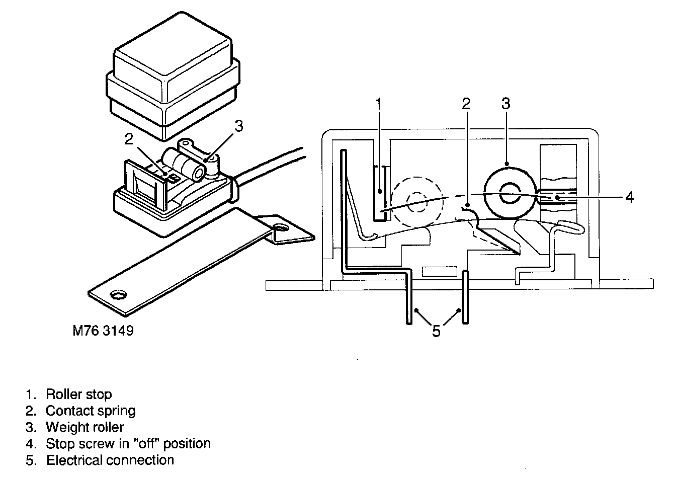 The internal components of the crash sensor consist of a weighted roller with a spring contact around it. Under deceleration, the roller unwinds the spring until a contact is made to provide a short circuit input to the DCU. This signal indicates that a rapid deceleration has been detected such as that which would be experienced during a frontal collision.
