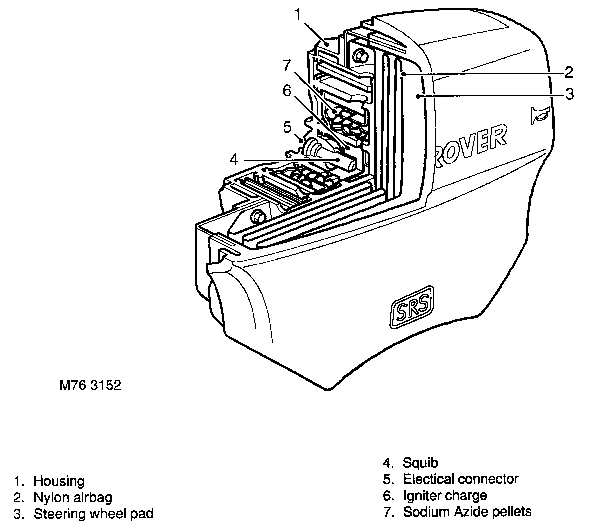 When a deployment signal has been received at the airbag module, the squib initiates combustion of the igniter charge. The igniter charge burns rapidly and produces sufficient heat to cause the gas generant pellets to burn and so produce a large quantity of nitrogen gas which is routed to the folded nylon airbag. The force of the inflating airbag causes the steering wheel polyurethane centre pad to split at deliberately weakened break points, and expands to form a protective cushion between the driver and the steering wheel windscreen.