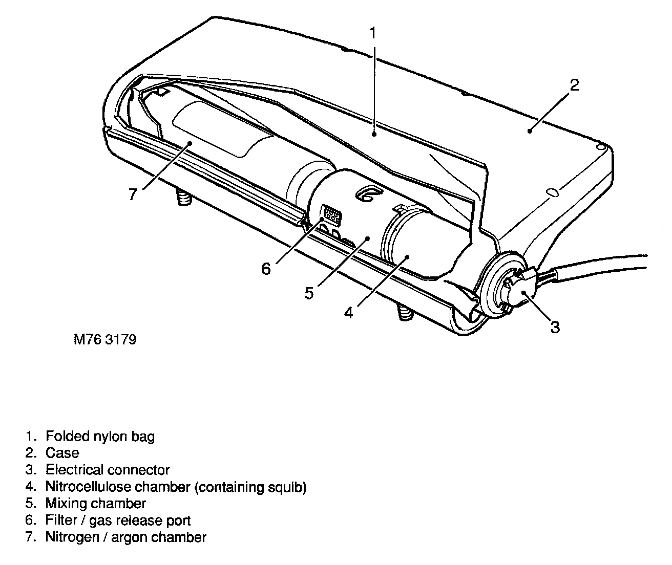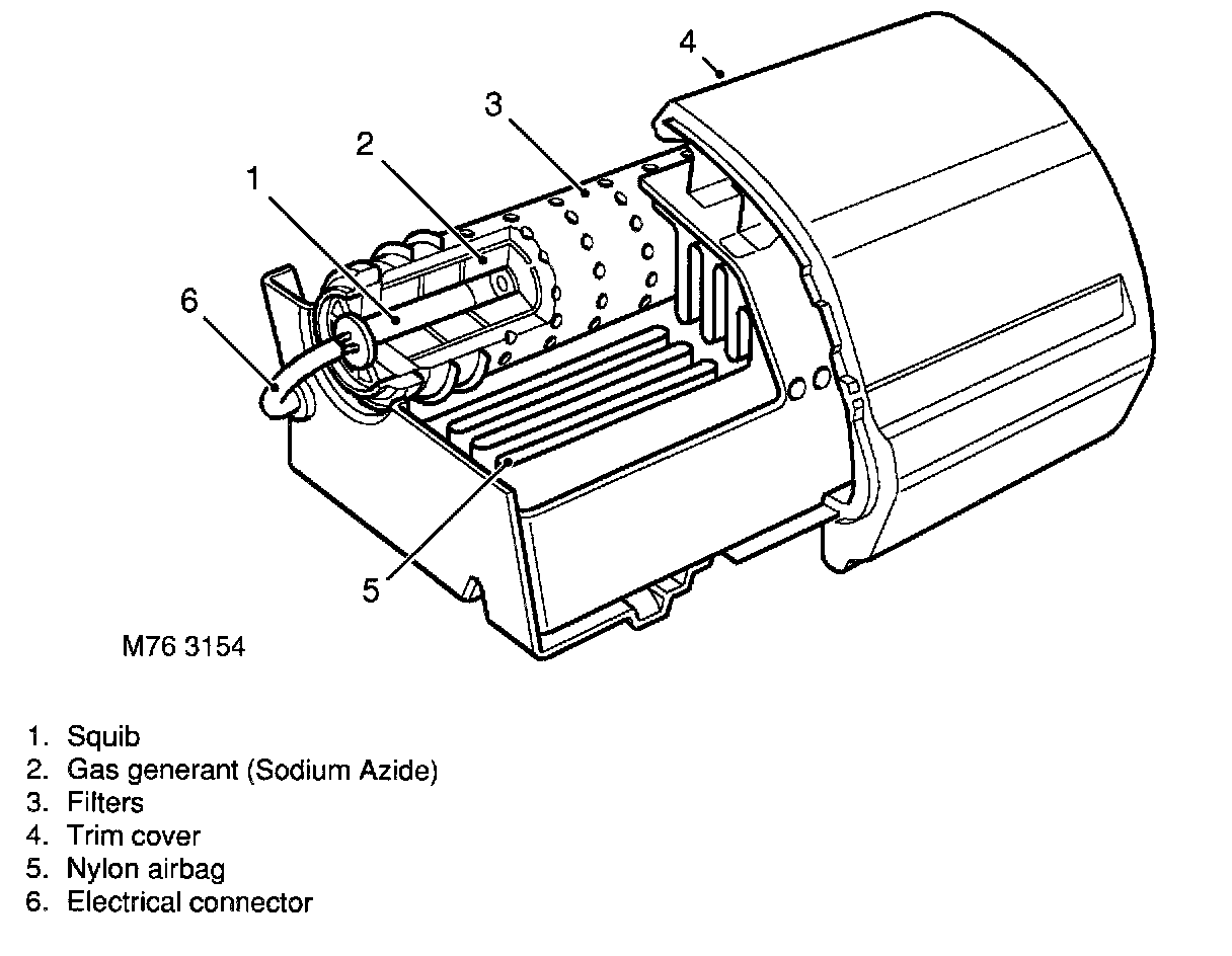 When a severe frontal impact is detected by the DCU, electronic switches are closed causing a small electrical current to be applied to the igniter squib. The igniter is activated to produce heat and cause the gas pellets to generate nitrogen gas which quickly inflates the nylon bag.