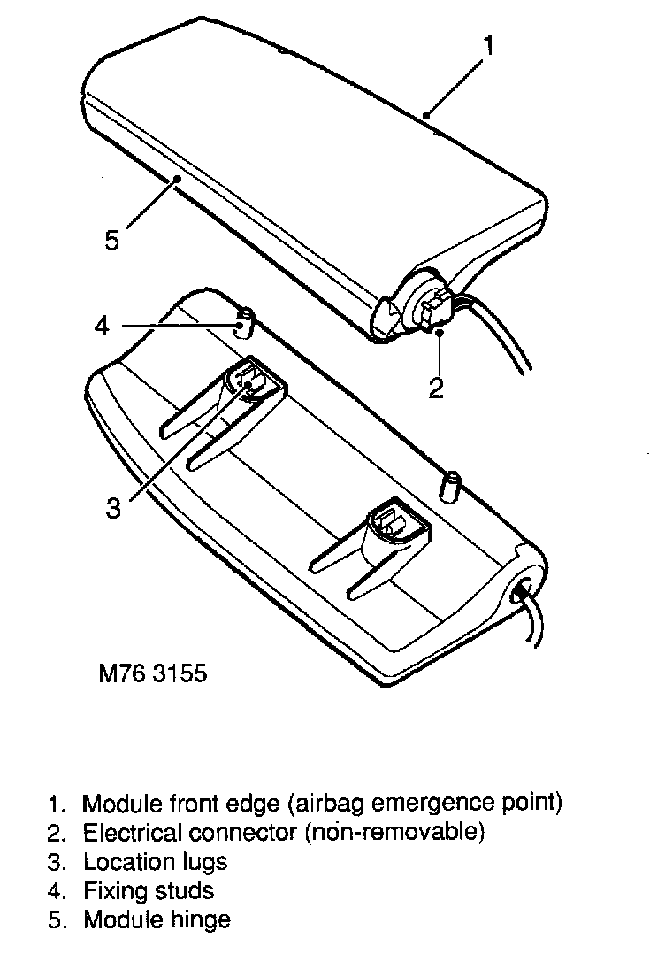 The side airbag module is a moulded plastic case which houses a folded nylon fabric bag, the gas generant capsules and an igniter squib. The rear of the side airbag module features two studs which are used for mounting the module to the seat frame and are secured in position by two nylock nuts. The back of the module also has moulded plastic location lugs, which are offset to ensure that only the correct handed module is fitted to the relevant seat.