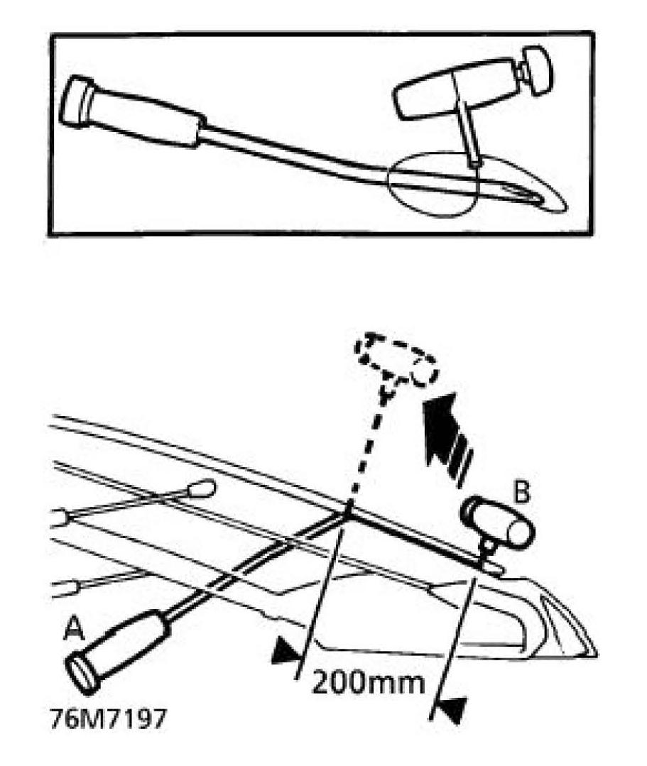 14. With assistance, wedge tube of handle 'A' between glass and body, ahead of the cutting position, and carefully cut the sealer using a continuous pull on handle 'B' from the outside. Cut side and top edges first. Attach suction lifters and restrain glass as last of sealant is cut.