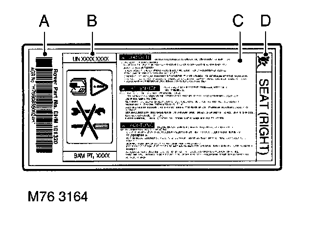 Warning symbols are displayed at various positions in the vehicle (in a suitable prominent position such as bonnet locking platform, centre fascia, sunvisor or etched onto the driver and passenger side glass), the front seats have a warning tag sewed to the beading of the seat trim to indicate the presence of the side airbag modules. SRS components have additional warnings displayed on them to indicate that particular care is needed when handling them. These include airbag modules, DCU, seat belts and rotary coupler.