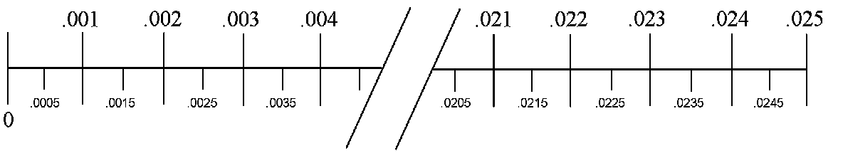 Each minor line = on half-thousandth of one inch (.0005)