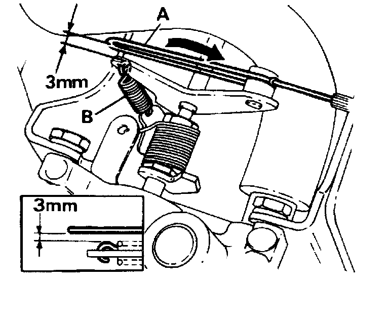 6. With throttle fully open, check a gap of at least 3 mm exists between side of link ('A' in illustration) and side of small spring ("B" in illustration). Realign link by bending to achieve correct gap. Recheck clearance at closed throttle/open throttle. Check link slides smoothly in groove of throttle lever.