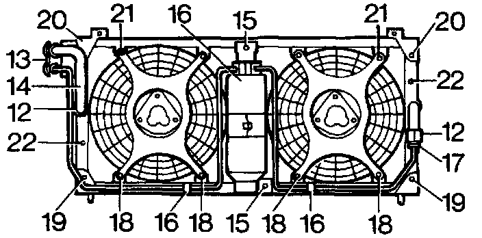 20. Remove 2 bolts and securing condenser upper mounting bracket.