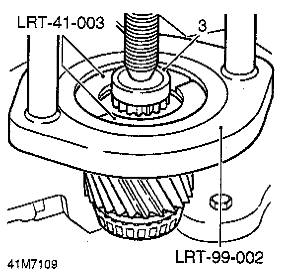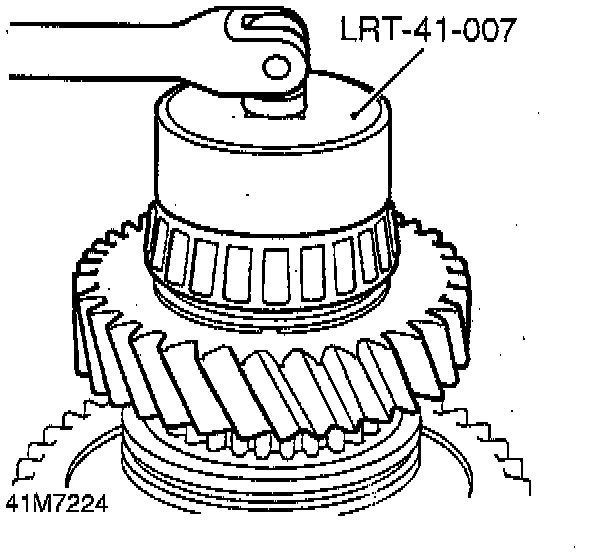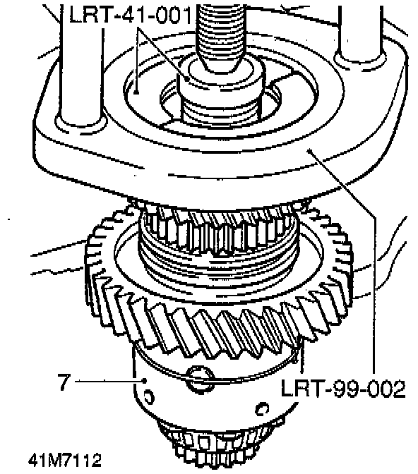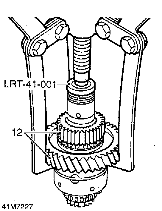 12. Using a suitable puller and thrust button, part of tool LRT-41-001, remove high/low hub and low range gear.