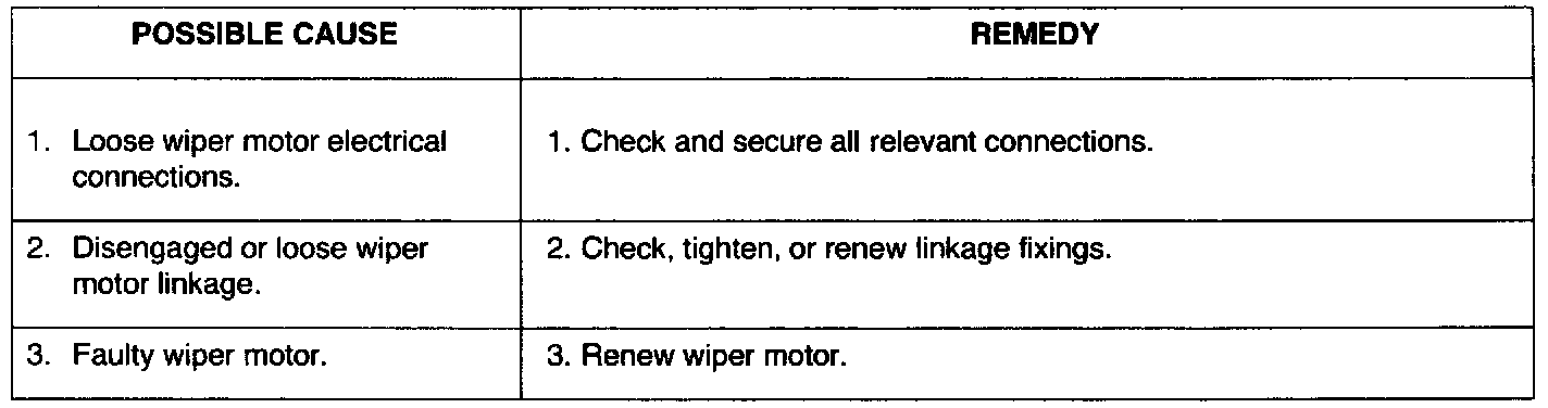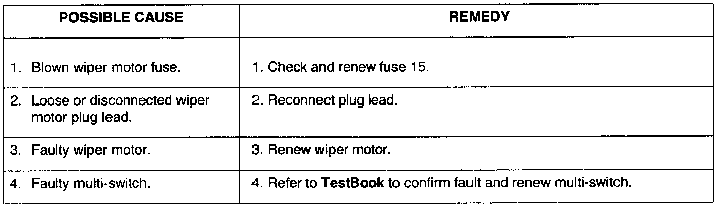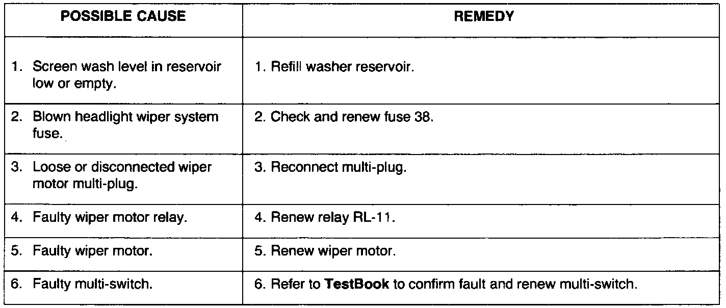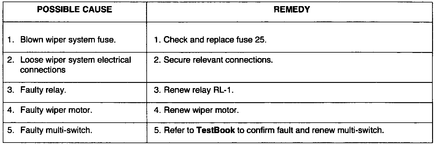 NOTE: This section covers mechanical, fuse, and possible relay faults that could occur in the wiper and washer system. visual checks of components within the system and relevant fuses should be carried out before undertaking detailed fault diagnosis procedures, see TestBook.