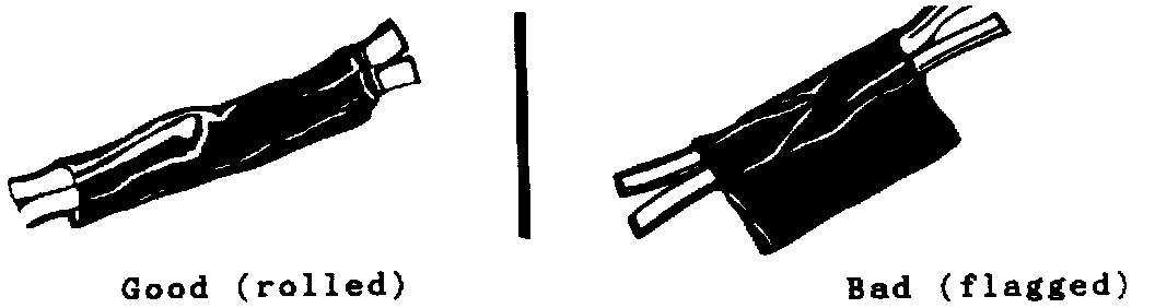 Center and roll the splicing tape. The tape should cover the entire splice. Roll on enough tape to duplicate the thickness of the insulation on the existing wires. Do not flag the tape. Flagged tape may not provide enough insulation, and the flagged ends will tangle with the other wires in the harness.