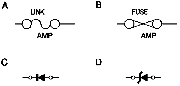 Fusible links (A) and current rated fuses (B), are identified as shown.