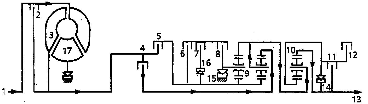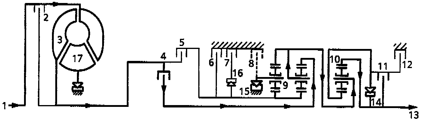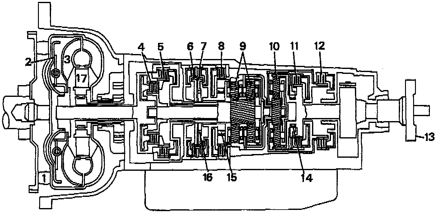 Clutches 4, 5, 7 and 12 are engaged. Freewheel 14, 15 and 16 are overrun. Epicyclic gear set 9 rotates as a solid unit. The hollow shaft with the sun wheel of epicyclic gear set 10 is locked.