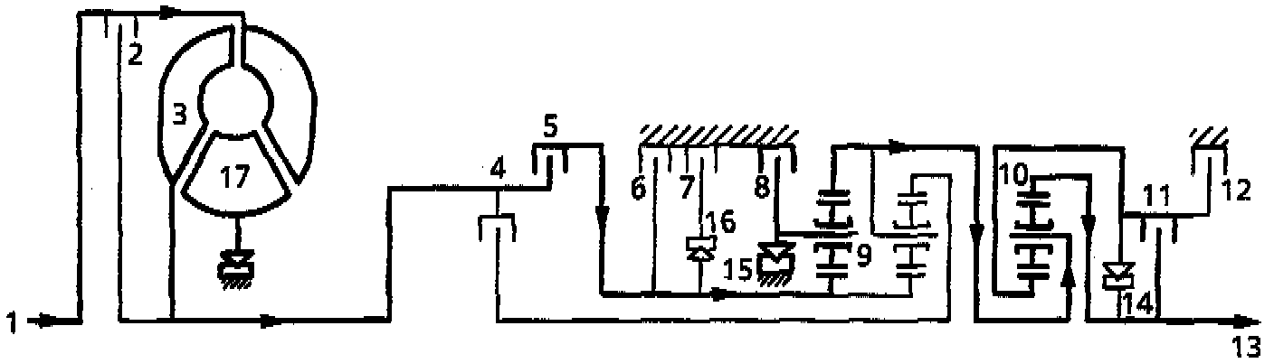With D selected 1st gear engaged, clutches 4 and 11 are operative. The front planet gear carrier of gear set 9 is locked against the housing through freewheel 15 when the engine is pulling but freewheels when the vehicle is coasting. Epicyclic gear set 10 rotates as a solid unit with the front planet gear carrier. In selector position 1 with 1st gear engaged, clutch 8 operates to prevent the loss of drive on the overrun through freewheel 15, to provide engine braking.