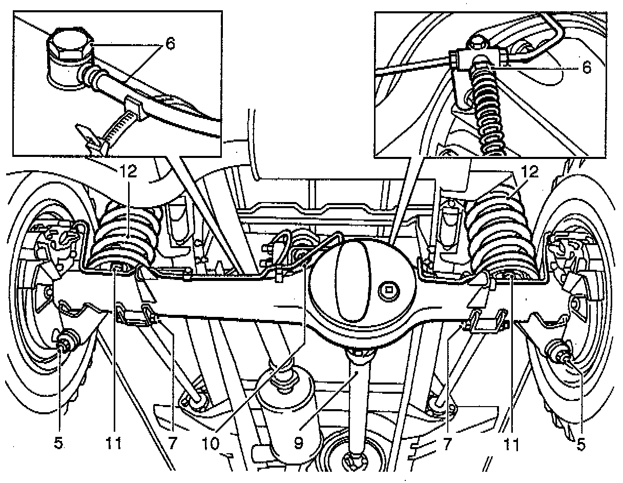6. Disconnect flexible brake hose at RH chassis crossmember and breather hose at banjo connection on axle casing.